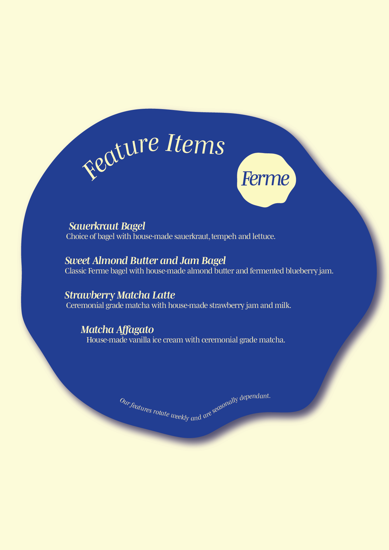 The features sheet stands out as a unique piece, incorporating the circular, organic shape of the Ferme logo. This shape flows through the design, creating a dynamic and engaging layout that draws attention to the shop’s special offerings. The interplay of the brand colors within this circular motif adds depth and visual interest.