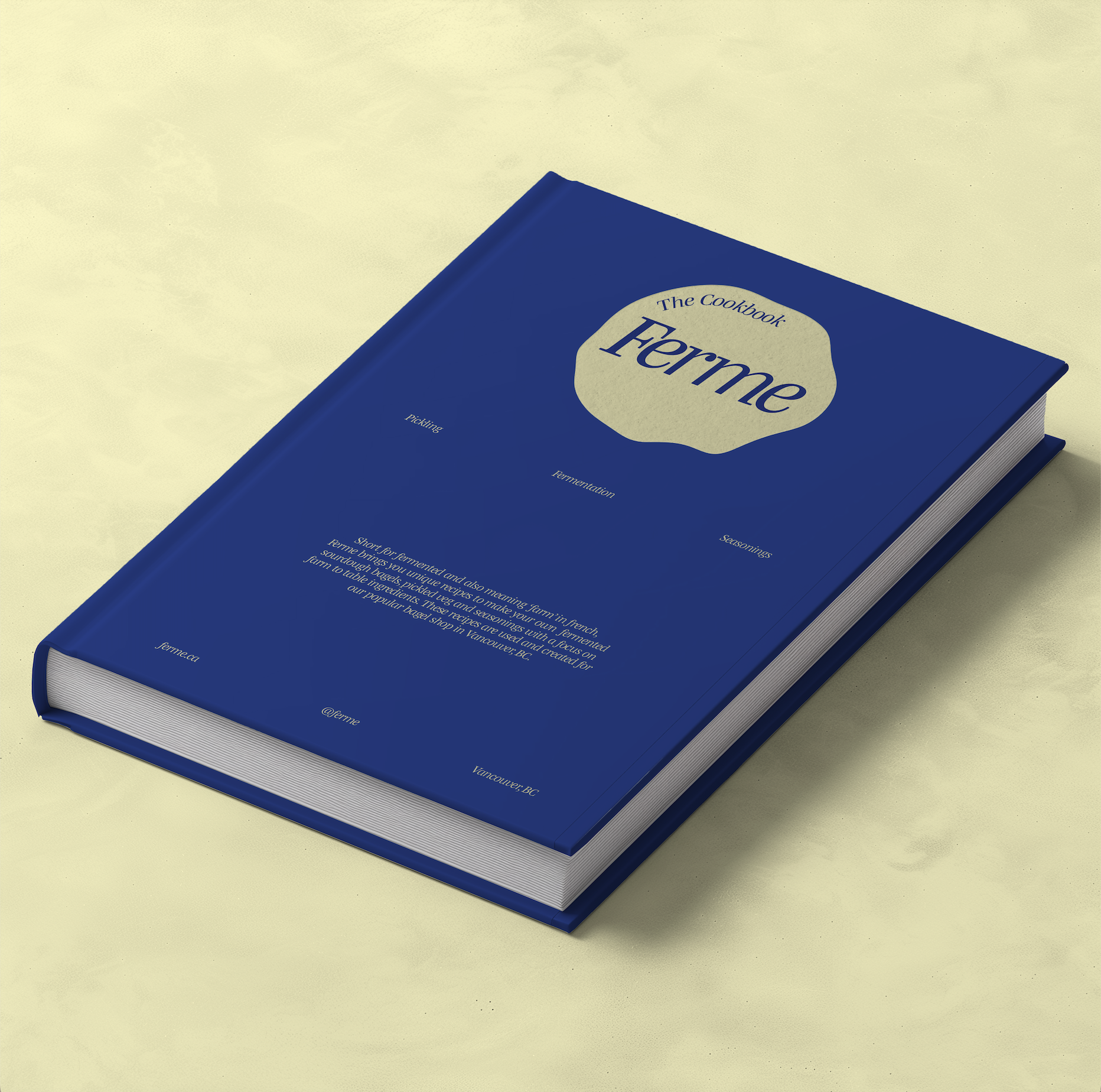 The design of Ferme Bagel Shop's menu, features sheet, bagel packaging, and cookbook reflects a cohesive and striking visual identity, unified by the brand’s signature cobalt blue and light yellow colors.
